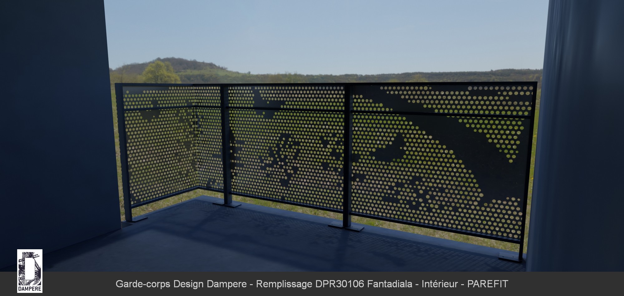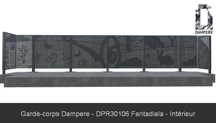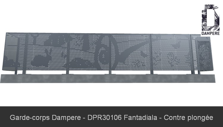 Le garde-corps métallique Fantadiala, adapté pour un balcon en milieu urbain avec une hauteur de 1 mètre entre nez de dalle et main courante, intègre un motif décoratif représentatif d’un paysage ludique de maisonnettes et arbres, dessinés à partir de perforations rondes sur une tôle métallique. Ce design enfantin et épuré, visible par les perforations, offre une transparence partielle tout en assurant une certaine intimité pour les occupants du balcon. Grâce à cette hauteur normée de 100 cm, le motif reste suffisamment visible et fonctionnel, tout en garantissant une protection solide et en respectant les normes de sécurité pour un garde-corps. Les trous perforés apportent de la lumière naturelle et permettent une ventilation légère, tout en masquant les regards indiscrets provenant de l’extérieur. La répétition du motif perforé crée un jeu de lumière tout au long de la journée, projetant des ombres mouvantes sur le sol du balcon, accentuant l’aspect vivant et dynamique de la structure de la balustrade. Ce garde-corps décoratif s'intègre parfaitement dans des environnements contemporains et urbains, en apportant une touche artistique tout en remplissant son rôle de sécurité. Le design "Fantadiala", avec sa scène naïve et ses formes géométriques simples, offre une harmonie visuelle qui équilibre le fonctionnel et l’esthétique moderne du balcon en centre-ville.Usages