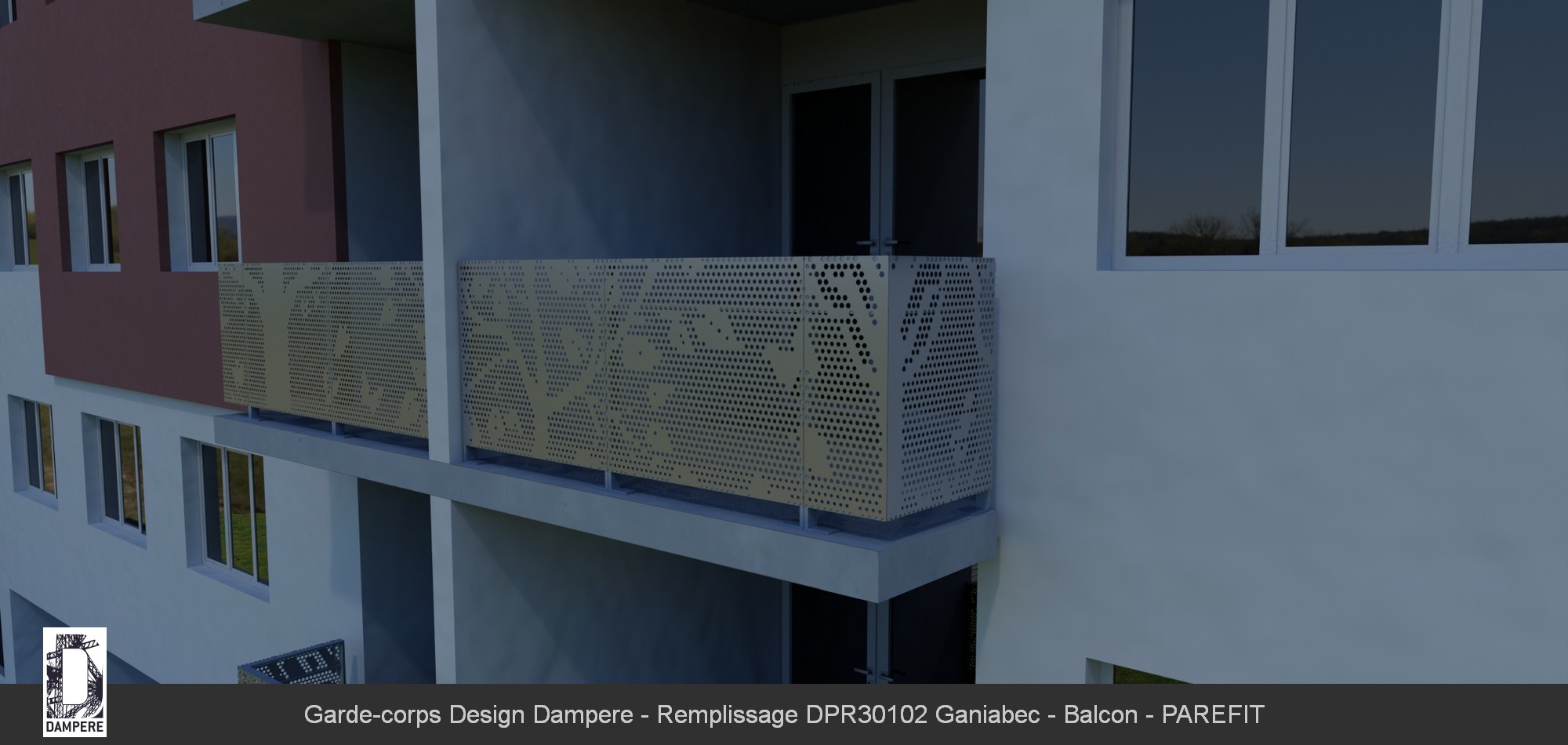 Pour affirmer la bonne tenue mécanique du moucharabieh abstrait appliqué au panneau de remplissage de garde corps GANIABEC, notre Bureau d'Etudes vous conseille d'optimiser la tôle perforée en Acier Galvanisé par une épaisseur de 20/10 ème pour répondre à la norme de sécurité garde corps NF P 01- 013. La réalisation d'essai destructif au sac sur une charge dynamique par choc de corps mou au diamètre de 50 cm en application 600 Joules, applique un impact au centre géométrique du panneau moucharabieh sur la balustrade.Opacité du balcon