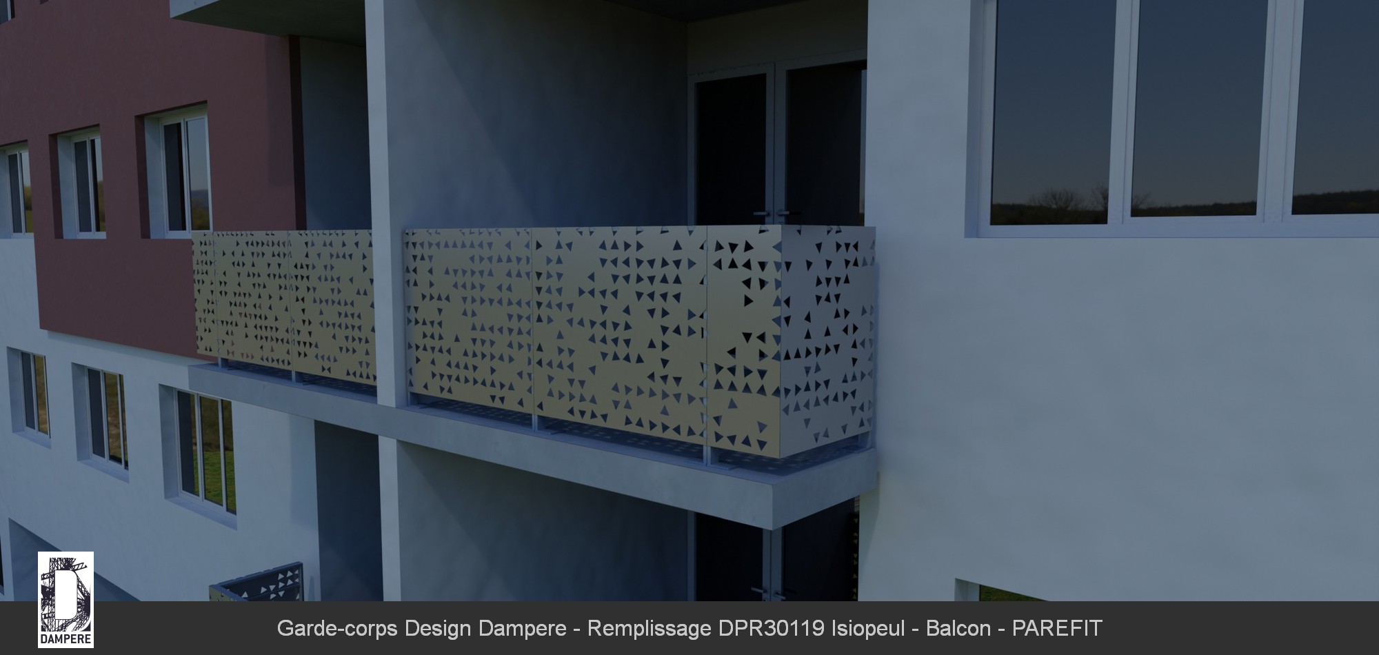 Ces formations géométriques aux contours symétriques, ajoutent une dynamique subtile que l'on voit uniquement de près. En fonction de la lumière qui traverse le panneau décoratif, la tôle perforée projette un jeu d'ombres délicats qui accentue l'effet naturel et aléatoire des découpes, apportant à l'espace une dimension graphique captivante. Le moucharabieh aléatoire dépasse la perception unique d'un remplissage de soubassement de garde-corps moderne. La découpe laser des centaines de triangles sur la tôle donne une puissante connotation graphique. Il s'agit d'un filtre de lumière permettant de captiver toute lumière avant de la retransmettre une fois filtrée en ombre projetée sur le sol du balcon. La distribution des découpes produit un effet de parcours aléatoire. Le contraste de transparence et de luminosité permet d'utiliser les découpes en prisme à leur meilleur potentiel, occasionnant une perception de nouvelle de la profondeur. La position alétoire des facettes triangulaires pemet de remplir toute forme de balcon, à la fois en couverture de nez de dalle pour une pose sur balcon à l'anglaise puis se développant en brise-soleil vertical ou en séparatif de balcon. L'occultation forte du moucharabieh métallique lui permet de cacher les objets déposés sur les balcons de logements collectifs et décore les façades de HLM.Le conseil de l'équipe