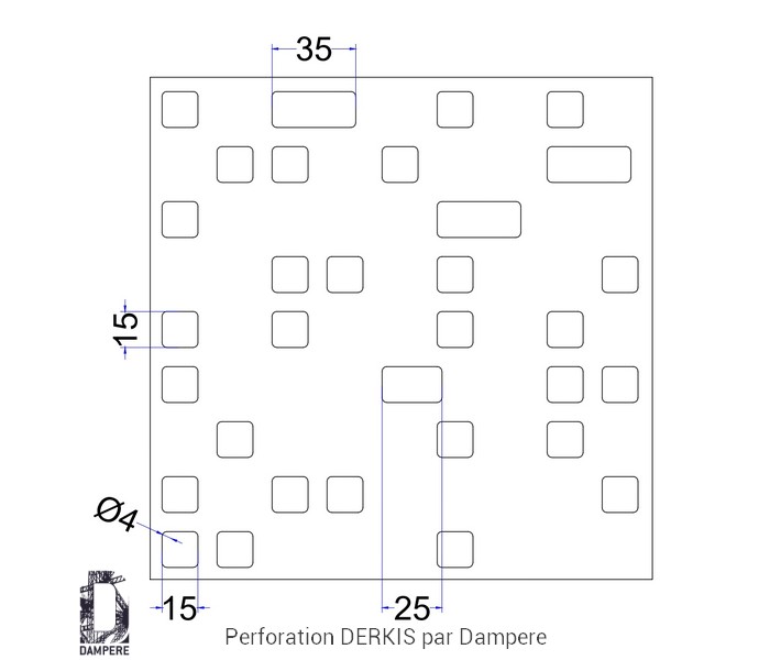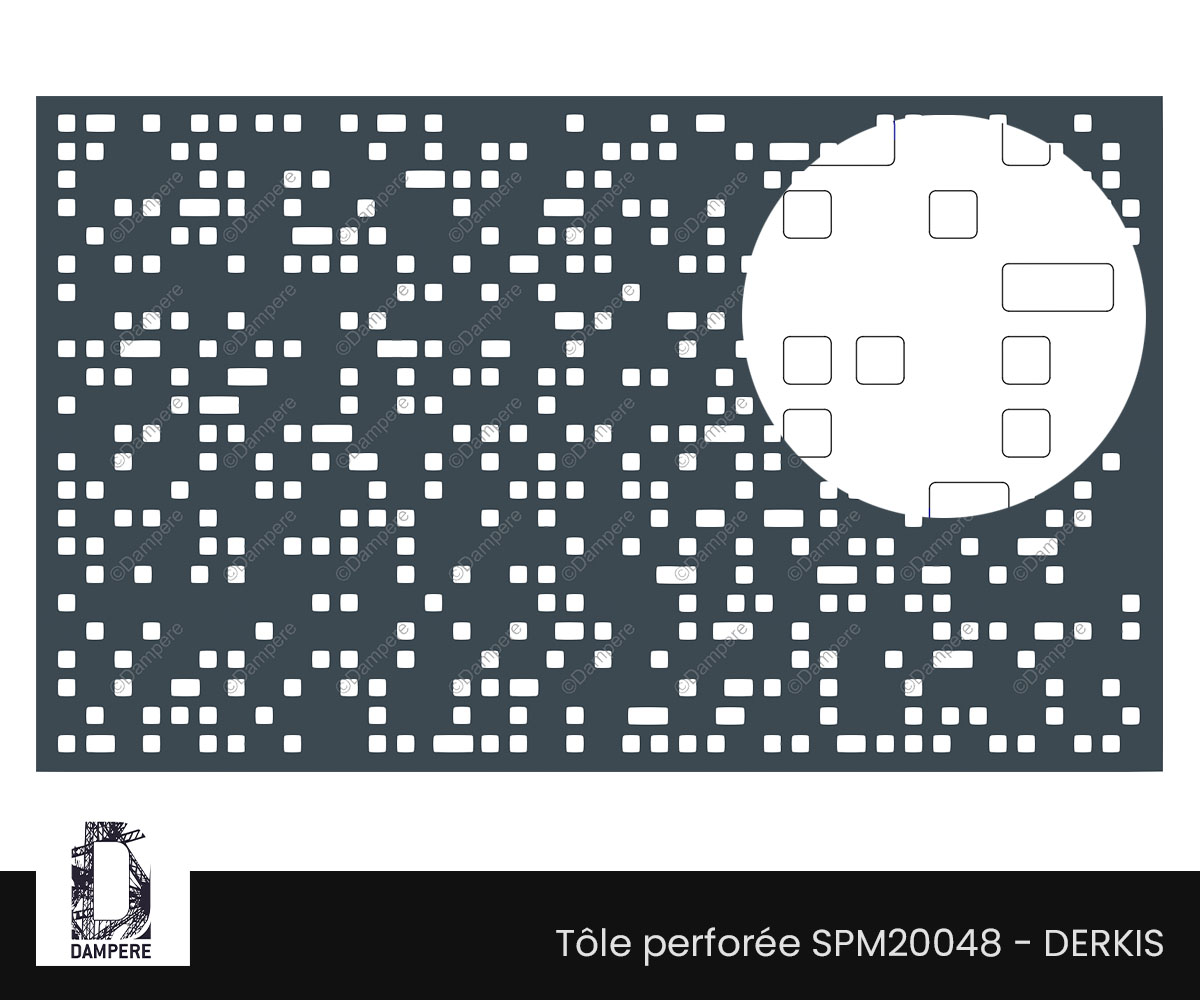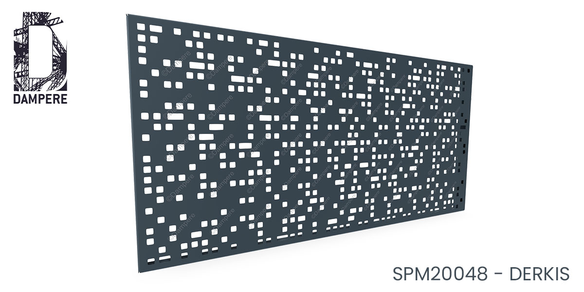 La tôle perforée décorative Derkis DAMPERE se distingue par un motif structuré alliant des trous rectangulaires et des carrés alignés horizontalement. Cette séquence géométrique crée une série de tramages visuels qui produisent un effet de strates horizontales, renforçant la linéarité et l'ordre dans le design. Le choix des formes rectangulaires et carrées en alternance est soigneusement pensé pour créer un motif à la fois rigide et harmonieux, qui guide subtilement l’œil le long de la surface du panneau décoratif. Le motif Derkis privilégie un effet occultant, offrant une opacité substantielle grâce à son taux de perforation d'environ 20% de vide. Cette caractéristique le rend particulièrement adapté pour des applications nécessitant une intimité accrue, tout en permettant une légère transparence. Ainsi, la lumière traverse les perforations avec subtilité, créant des jeux d'ombres doux sans compromettre l'occultation. Cet effet de strates visuelles peut également être perçu comme un renforcement de l’effet architectural, apportant une sensation de profondeur et de stabilité au bâtiment ou à la structure qu'il habille. En extérieur, la tôle perforée Derkis s'intègre parfaitement dans des projets urbains ou modernes, ajoutant une dimension esthétique sobre et élégante tout en conservant une fonctionnalité maximale. Les applications de cette tôle perforée peuvent varier, allant de garde-corps à des clôtures ou encore des claustras, grâce à son effet occultant et sa structure apaisante de formes géométriques régulières.Usages