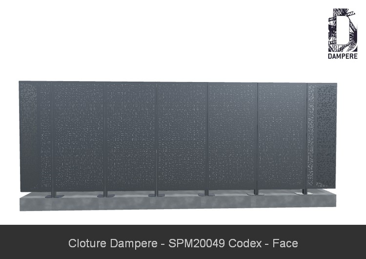 Pour l'univers de la clôture de parc et jardin, la tôle perforée Codex DAMPERE se démarque par son motif de trous carrés aléatoires, parfaitement adapté à des environnements extérieurs. Grâce à sa séquence arithmétique chaotique, les perforations créent un effet visuel captivant tout en maintenant une certaine harmonie entre rigueur géométrique et liberté abstraite. Dans un contexte de clôture de parc ou jardin, la tôle décorative Codex permet une transparence partielle qui laisse passer la lumière tout en garantissant une intimité relative. Cet effet d'occultation rend le panneau idéal pour des espaces verts où l'on souhaite protéger certaines zones tout en maintenant une ouverture visuelle, afin de profiter des plantes, des fleurs, et de l'environnement naturel. Le motif, à la fois fonctionnel et esthétique, assure un effet filtrant pour limiter les regards extérieurs tout en laissant entrer partiellement de lumière. La tôle perforée Codex devient ainsi un élément distingué dans l'aménagement d'un parc ou d'un jardin, visible même à distance grâce à la clarté de ses motifs géométriques.Usages