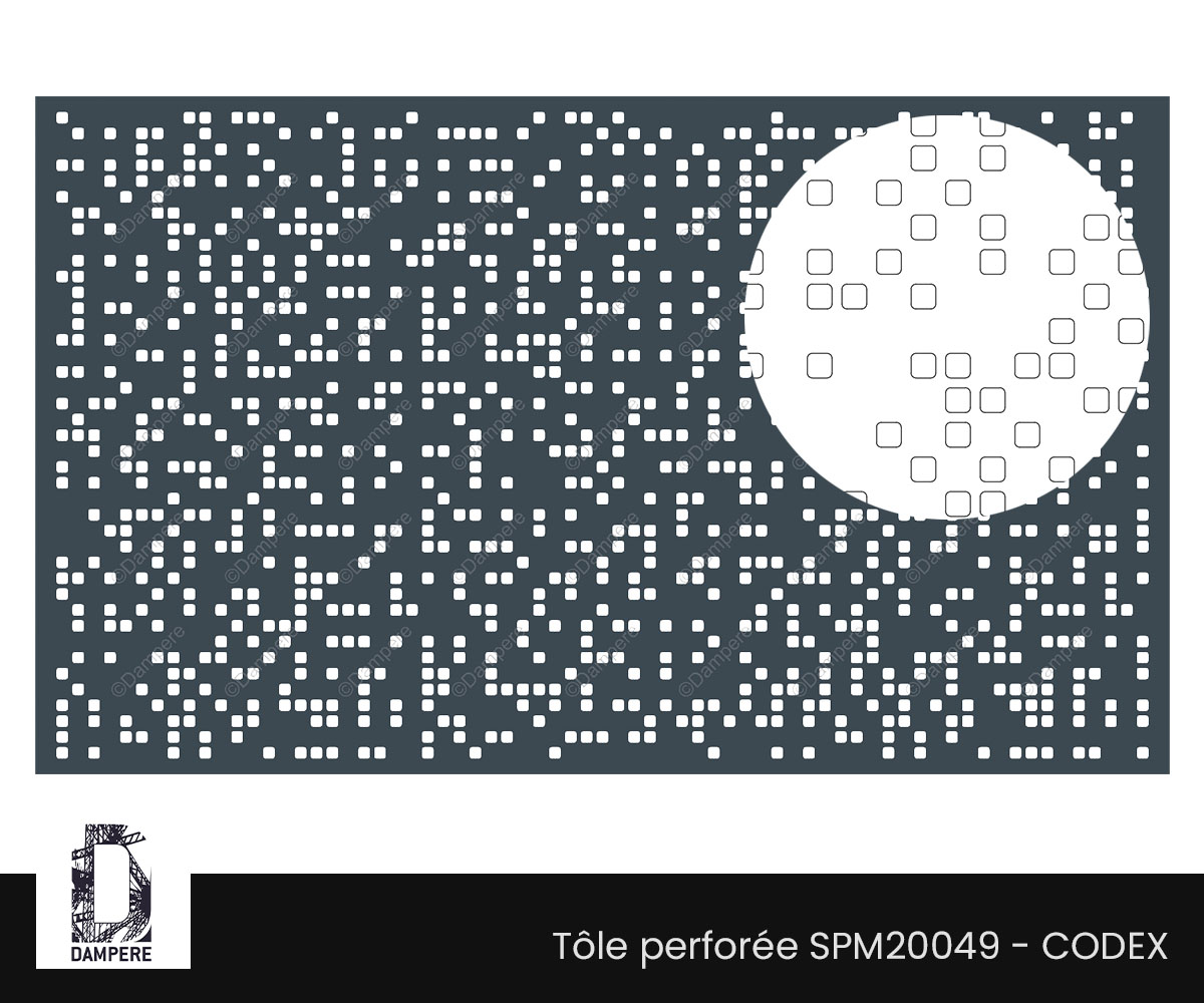 La tôle perforée décorative Codex DAMPERE se distingue par un motif complexe composé d'une nuée de perforations carrées distribuées de manière apparemment aléatoire, mais orchestrées selon une permutation arithmétique. Ce design, loin du désordre, est guidé par une séquence mathématique chaotique, qui donne à l'ensemble une allure organique tout en étant structuré. Les perforations varient subtilement dans leur position, créant un effet visuellement diffus qui capte la lumière de manière unique, en générant des jeux d’ombres en lien avec le chaos originel du motif. L'effet produit par la répartition orthonormée des points renforce la perception d'un motif aléatoire mais calculé, offrant une esthétique résolument contemporaine. Ce type de design joue avec les notions de rigueur géométrique et de liberté visuelle, où les perforations carrées, bien qu'encadrées par des lignes invisibles, semblent se libérer de toute contrainte. Cela crée un dynamisme captivant, où l'œil suit les variations subtiles sans jamais pouvoir anticiper la prochaine permutation. Grâce à cette organisation en séquence mathématique qui permet une délimitation dans une géométrie nette, la tôle perforée décorative Codex est idéale pour des applications telles que des garde-corps, des façades ou des clôtures métalliques, apportant un effet graphique moderne et innovant à tout projet architectural.Usages