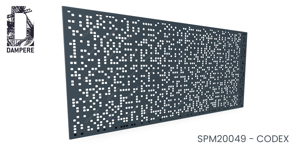 La tôle perforée décorative Codex DAMPERE est extrêmement polyvalente dans son usage. Elle s'intègre aussi bien en intérieur pour des éléments décoratifs d'ameublement design en claustra que pour des applications extérieures telles que clôtures métalliques ou remplissage de soubassements de garde-corps de balcon. Son motif de perforations carrées aléatoires, guidé par des séquences arithmétiques, confère une dimension artistique unique aux espaces qu'elle habille, qu'il s'agisse d'habiller des façades ou de créer des séparations visuelles en extérieur. La cadence des perforations, calculée avec soin, est non seulement visuellement captivante de près, mais elle reste perceptible jusqu'à une distance d'environ 10 mètres. Cette richesse graphique fait de la tôle perforée Codex un excellent choix pour des projets architecturaux nécessitant un impact visuel à distance, tout en conservant une richesse de détails à proximité. En extérieur, la lumière interagissant avec les perforations carrées produit un jeu d'ombres changeant, ajoutant du dynamisme au design, tandis qu'en intérieur, ce motif offre un rendu moderne et texturé. Pour des clôtures occultantes ou des garde-corps de balcon, l'effet diffus des perforations permet de préserver une certaine intimité tout en maintenant une transparence partielle du moucharabieh métallique, garantissant ainsi à la fois la sécurité et l'esthétisme. Grâce à son caractère à la fois abstrait et géométrique, la tôle perforée Codex DAMPERE s’adapte aisément à différents styles architecturaux, qu’ils soient contemporains ou plus traditionnels.Le conseil de l'équipe