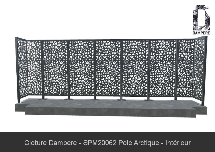 La clôture Pôle Arctique DAMPERE, avec ses formes angulaires adoucies découpées au laser, est particulièrement adaptée à des projets haut de gamme, tels que des résidences de standing ou des bureaux de luxe. Son design moderne et poétique, inspiré de la brisure de glace, apporte une dimension esthétique unique qui s'harmonise parfaitement avec des matériaux nobles comme le bois exotique pour le sol ou des finitions contemporaines en béton ou verre. Cette clôture occultante est idéale pour créer une ambiance raffinée tout en assurant une protection visuelle et physique. Les motifs découpés au laser offrent un jeu subtil de lumière et d'ombres, renforçant l’aspect haut de gamme du projet tout en préservant une certaine transparence qui maintient une connexion visuelle avec l'extérieur. Recommandée pour des espaces extérieurs élégants, comme des terrasses privées, des jardins d’immeubles résidentiels, ou des environnements professionnels de prestige, la clôture Pôle Arctique combine sécurité, intimité, et design de moucharabieh sophistiqué, s’intégrant parfaitement dans des projets architecturaux contemporains.Effet produit